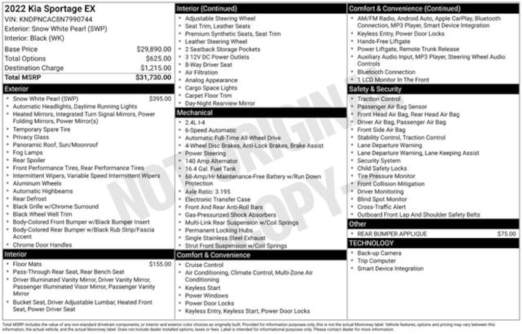 Recent Arrival! 2022 Kia Sportage EX 2.4L I4 DGI DOHC 16V 6-Speed Automatic Electronic with Overdrive AWD 4D Sport Utility Snow White Pearl AWD, 18" Machine-Finished Alloy Wheels, 4-Wheel Disc Brakes, 6 Speakers, ABS brakes, Air Conditioning, Alloy wheels, AM/FM radio, Apple CarPlay & Android Auto, Auto High-beam Headlights, Automatic temperature control, Axle Ratio: 3.195, Brake assist, Bumpers: body-color, Carpeted Floor Mats, Delay-off headlights, Driver door bin, Driver vanity mirror, Dual front impact airbags, Dual front side impact airbags, Electronic Stability Control, Exterior Parking Camera Rear, Four wheel independent suspension, Front anti-roll bar, Front Bucket Seats, Front Center Armrest, Front dual zone A/C, Front fog lights, Front reading lights, Fully automatic headlights, Heated door mirrors, Heated Front Bucket Seats, Heated front seats, Illuminated entry, Leather Shift Knob, Leather steering wheel, Leatherette Seat Trim, Low tire pressure warning, Occupant sensing airbag, Outside temperature display, Overhead airbag, Overhead console, Panic alarm, Passenger door bin, Passenger vanity mirror, Power door mirrors, Power driver seat, Power Liftgate, Power moonroof, Power steering, Power windows, Radio: AM/FM Audio System, Rear anti-roll bar, Rear Bumper Applique, Rear seat center armrest, Rear window defroster, Rear window wiper, Remote keyless entry, Roof rack: rails only, Security system, Speed control, Speed-sensing steering, Split folding rear seat, Spoiler, Steering wheel mounted audio controls, Tachometer, Telescoping steering wheel, Tilt steering wheel, Traction control, Trip computer, Turn signal indicator mirrors, Variably intermittent wipers, AWD.