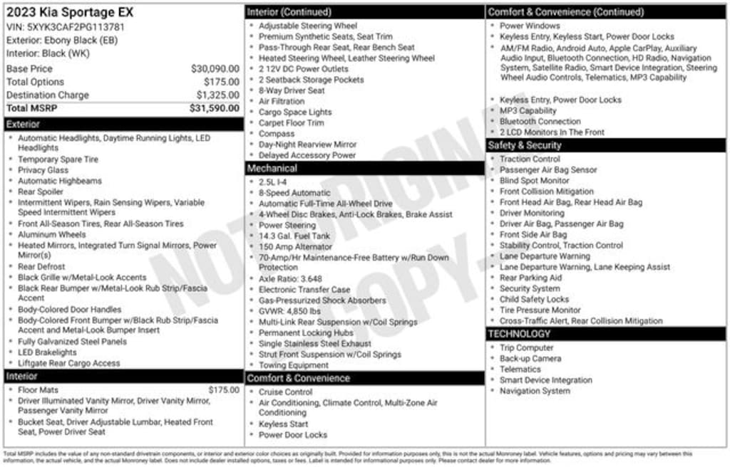 Recent Arrival! 2023 Kia Sportage EX I4 8-Speed Automatic AWD 4D Sport Utility Ebony Black AWD, 4-Wheel Disc Brakes, 6 Speakers, ABS brakes, Air Conditioning, Alloy wheels, AM/FM radio: SiriusXM, Apple CarPlay & Android Auto, Auto High-beam Headlights, Automatic temperature control, Axle Ratio: 3.648, Brake assist, Bumpers: body-color, Carpeted Floor Mats, Compass, Delay-off headlights, Driver door bin, Driver vanity mirror, Dual front impact airbags, Dual front side impact airbags, Electronic Stability Control, Emergency communication system, Four wheel independent suspension, Front anti-roll bar, Front Bucket Seats, Front Center Armrest, Front dual zone A/C, Fully automatic headlights, Heated door mirrors, Heated Front Bucket Seats, Heated front seats, Heated steering wheel, Illuminated entry, Leather Shift Knob, Leather steering wheel, Leatherette Seat Trim, Low tire pressure warning, Navigation System, Occupant sensing airbag, Outside temperature display, Overhead airbag, Overhead console, Panic alarm, Passenger door bin, Passenger vanity mirror, Power door mirrors, Power driver seat, Power steering, Power windows, Radio: AM/FM/HD Audio System, Rain sensing wipers, Rear anti-roll bar, Rear seat center armrest, Rear window defroster, Rear window wiper, Remote keyless entry, Security system, Speed control, Speed-sensing steering, Split folding rear seat, Spoiler, Steering wheel mounted audio controls, Tachometer, Telescoping steering wheel, Tilt steering wheel, Traction control, Trip computer, Turn signal indicator mirrors, Variably intermittent wipers, Wheels: 18" Machine Finish Alloy, AWD.